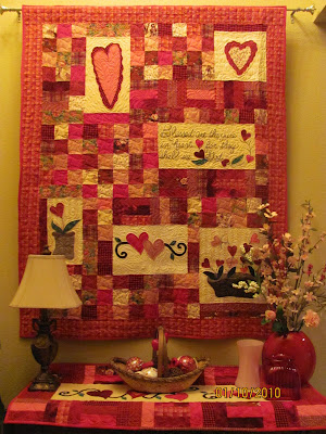 Lime green has become one of my favorite colors, closing following red and turquoise. It just brightens the day, don't you think? We've had a bit of sunshine the past few days here in "Green Country" (NE Oklahoma) but I was so busy sewing that I didn't get out and enjoy it. I made my own sunshine! This little quilt will be sold at the Green Country Quilters' Guild show in June (4th and 5th) at the Small Quilt Auction benefiting our guild.